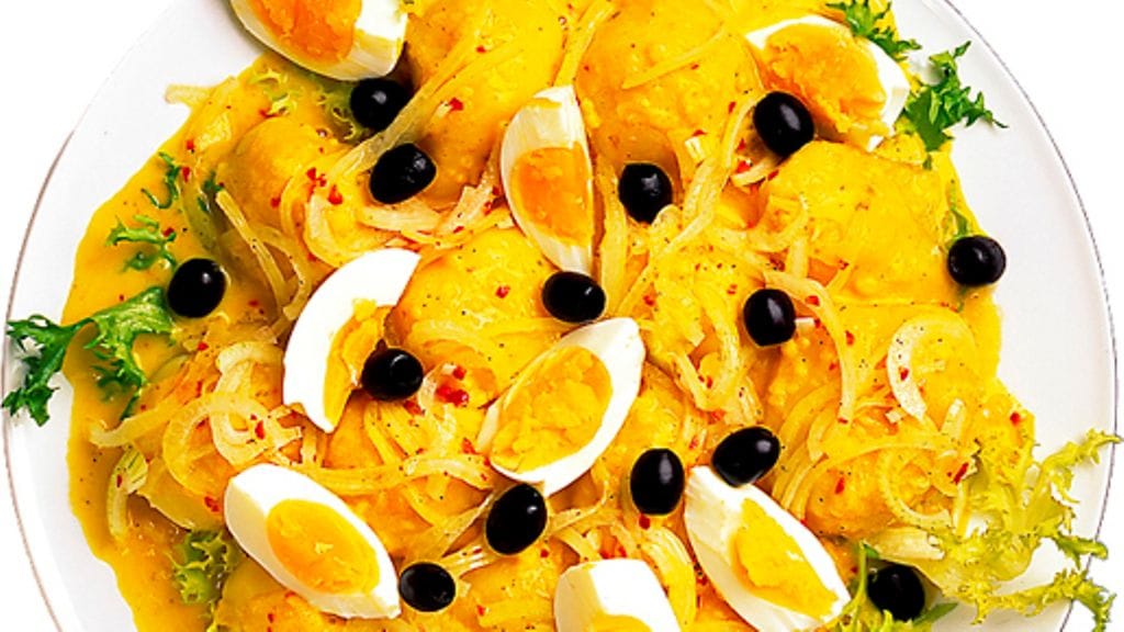 3. Keitä perunat pehmeiksi. Kuori kovaksi keityt munat ja leikkaa ne lohkoiksi. Siirrä perunat lämpimään astiaan ja kaada päälle kastike. Valuta sipulirenkaat ja asettele ne perunoiden päälle. Ripottele päällä myös teelusikallinen hienonnettua chiliä. Koristele munilla, oliiveilla ja salaatilla.