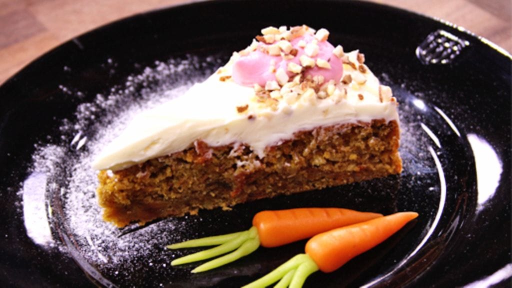 Vaahdota munat, keltuainen ja sokerit. Lisää joukkoon yhteen sekoitetut kuivat aineet, lisää öljy ja viimeisenä raasteet ja mantelirouhe. Kaada vuokaan ja paista noin 165-asteisesa uunissa 45-50 minuuttia. Anna kakun jäähtyä hyvin ennen kuorruttamista.