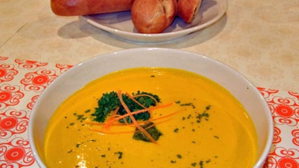 Yrteistä rakuuna sopii erityisen hyvin porkkanan mausteeksi. Soseuta keitto aivan sileäksi. Koristele ja viimeistele tilkalla pestoa ja tarjoa keiton kanssa tuoretta valkosipulipatonkia.