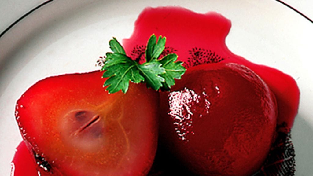 3. Kuori päärynät, mutta jätä kannat paikoilleen. Laita päärynät mehuun ja keitä niitä hiljalleen, kunnes ne ovat lähes pehmeitä, noin 35 minuuttia. Jätä päärynät jäähtymään liemeen. Tarjoile kermavaahdon kera ja sirottele pinnalle hieman jauhettua kanelia.