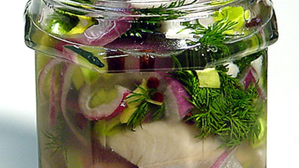 3. Lado sillipaloja, sipulia, purjoa, tilliä ja mausteita purkkiin. Kaada liemi päälle.