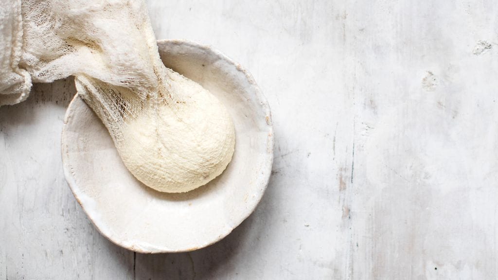 Anna juuston seistä kattilassa noin 5 minuuttia. Vuoraa sillä aikaa siivilä harsokankaalla ja aseta se kulhon päälle. Kaada maito hitaasti harsolla vuorattuun siivilään ja anna valua noin puoli tuntia. Jos haluat tiiviimpää juustoa, anna valua hieman kauemmin.