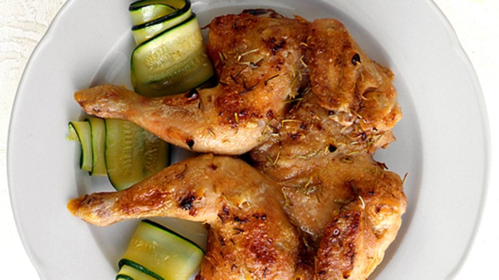 3. Työnnä broileri uuniin ja paista sitä 25 minuuttia. Kananliha on kypsää, kun lihaneste on väritöntä ja kirkasta.