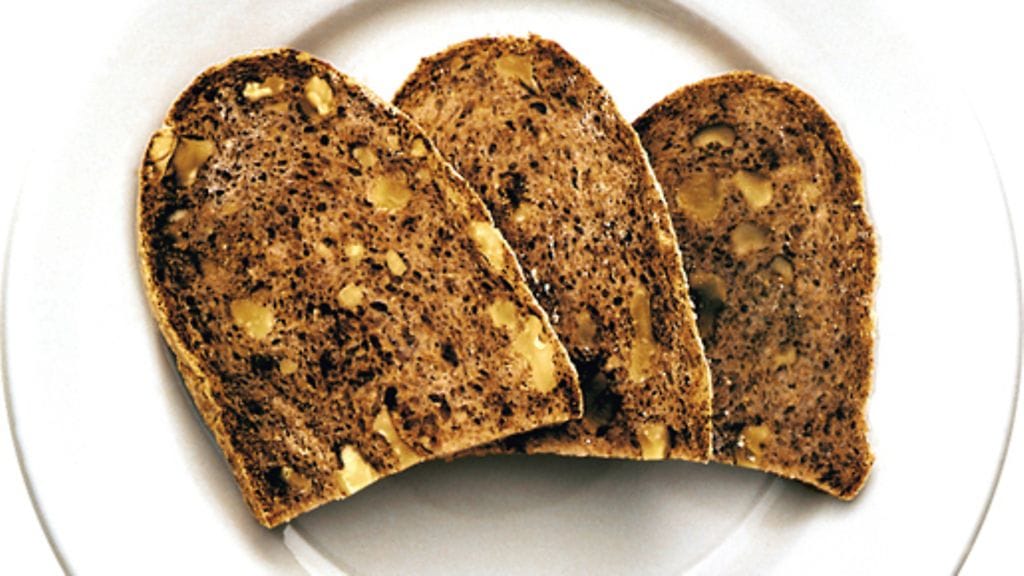 3. Rouhi saksanpähkinät ja vaivaa ne taikinaan. Muotoile jauhotetuin käsin kaksi pyöreää leipää ja nosta ne jauhotettuihin koreihin. Anna leipien kohota noin puoli tuntia. Kuumenna uuni 200 asteeseen. Kumoa varovasti kohonneet leivät leivinpaperilla peitetylle pellille ja paista noin puoli tuntia. Anna leipien jäähtyä ritilällä keittiöpyyhkeen alla.