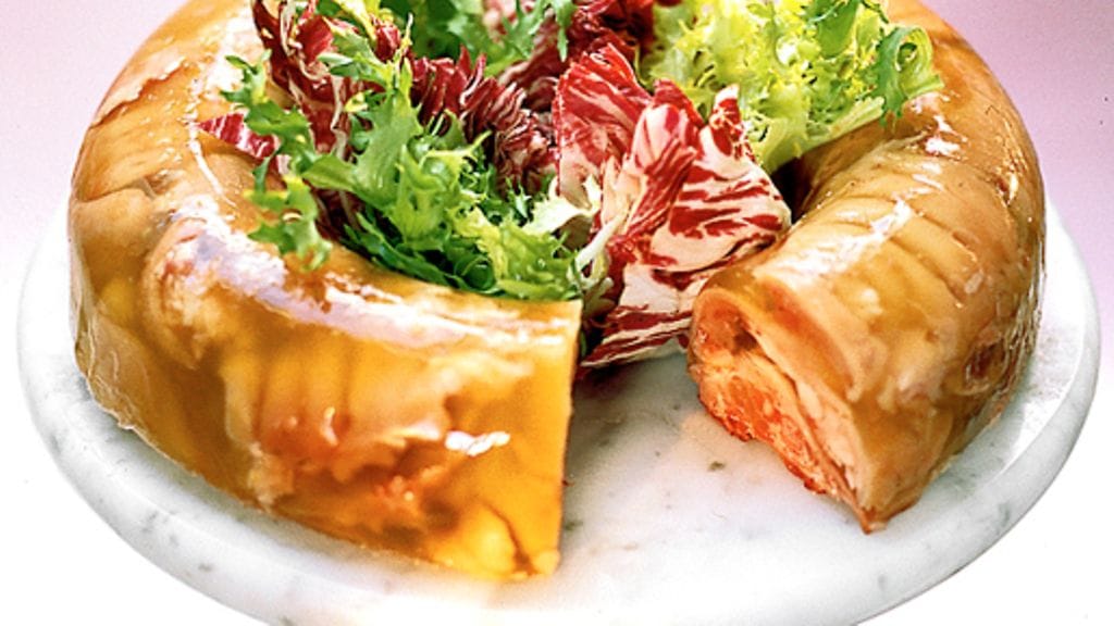 3. Laita lihat vedellä huuhdottuun vuokaan. Kuori tarvittaessa rasva pois liemestä ja siivilöi. Kaada sen jälkeen liemi lihojen päälle ja laita vuoka kylmään jähmettymään.