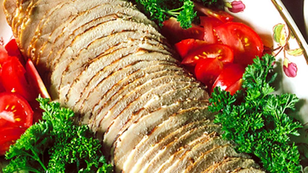 3. Sekoita kaikki kastikeainekset sähkövatkaimella. Viipaloi kinkku ohuiksi siivuiksi. Tarjoile lämpimien vihannesten kanssa.