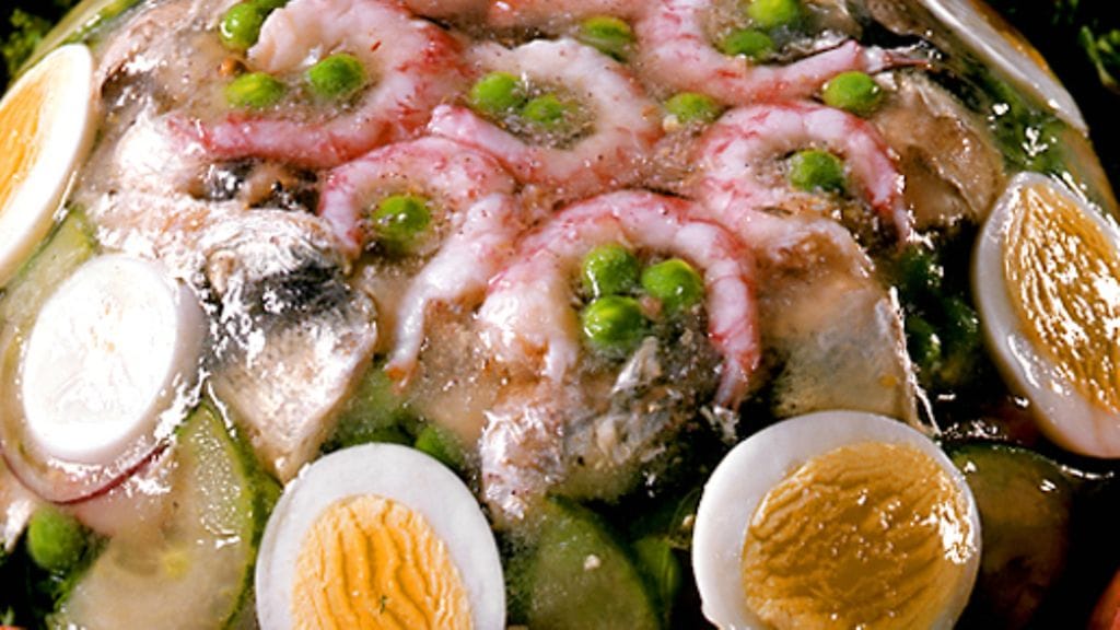 3. Ota esiin vuoka tai kulho hyytelölle. Laita pohjalle hieman herneitä ja kymmenkunta katkarapua, kaada päälle hieman lientä. Laita vuoka kylmään kunnes hyytelö alkaa jähmettyä.
