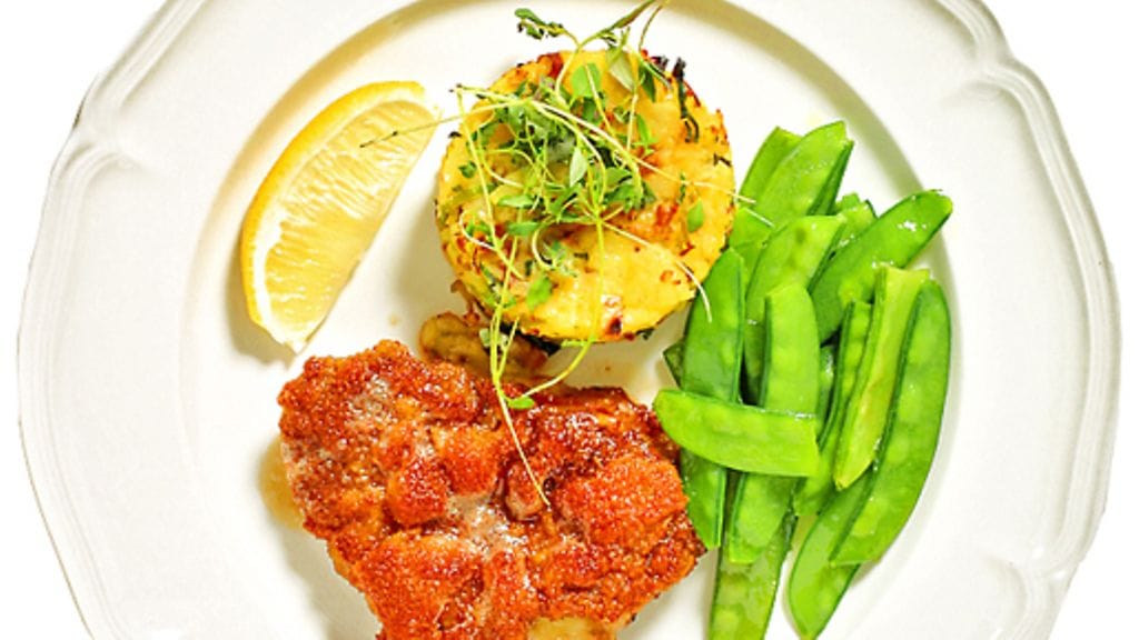 1. Leike: Kuumenna uuni 225 asteeseen. Puhdista lihat kalvoista ja nuiji ne ohuiksi leikkeiksi. Aseta kinkkusiivu kahden emmentalsiivun väliin ja aseta ne leikkeiden puolikkaille, käännä leikkeiden tyhjä puoli päälle ja painele reunat yhteen kunnolla. Mausta suolalla ja valkopippurilla. Tuplapaneeraa leike ensin jauhoissa, sitten kananmunan kautta korppujauhoissa. Ruskista leikkeet kummaltakin puolelta öljyssä paistinpannulla. Laita sitten leikkeet voideltuun, uuninkestävään vuokaan ja paista valmiiksi uunissa.