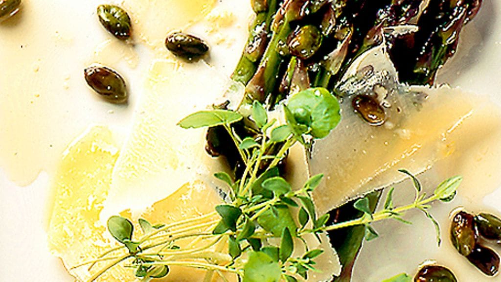 3. Sulata sillä välin voi, paahda pistaasit kuivalla paistinpannulla ja leikkaa juustosta juustohöylällä ohuita viipaleita tai raasta se raastinraudan karkealla terällä. Nosta parsat lautasille ja koristele juustolla, pistaaseilla ja krassilla. Tarjoa lisänä voisulaa.