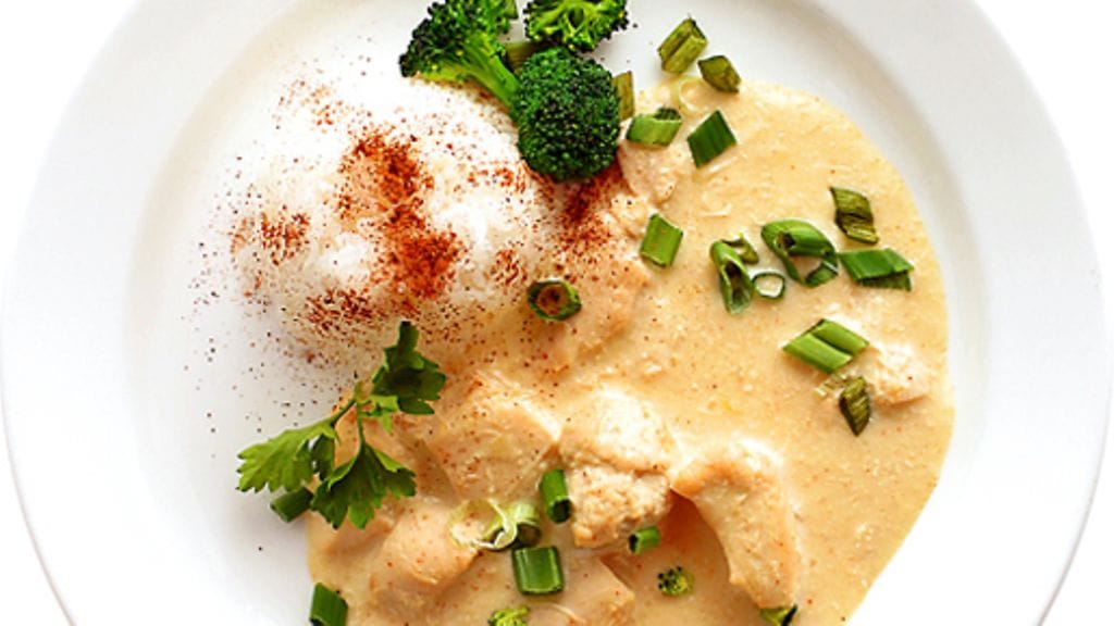 3. Ruskista kanapalat kuumassa pannussa tai mielellään paistopadassa, koska marinadi roiskuu. Kaada päälle kookosmaito ja kerma ja anna kiehua hiljalleen 5-6 minuuttia. Maista ja mausta tarvittaessa suolalla.
