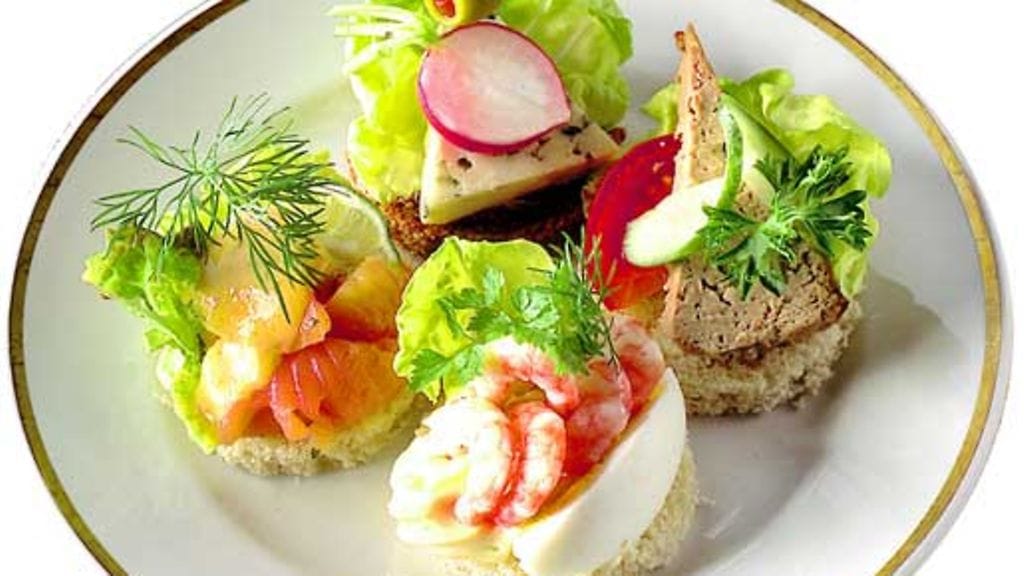 2. Lohisandwich: Pyöritä lohiviipaleet ruusukkeiksi. Aseta ruusukkeet neljälle ruisleivälle. Lisää päälle sinappi-tillikastiketta ja koristele tillinoksalla ja pienellä limetti- tai sitruunalohkolla.