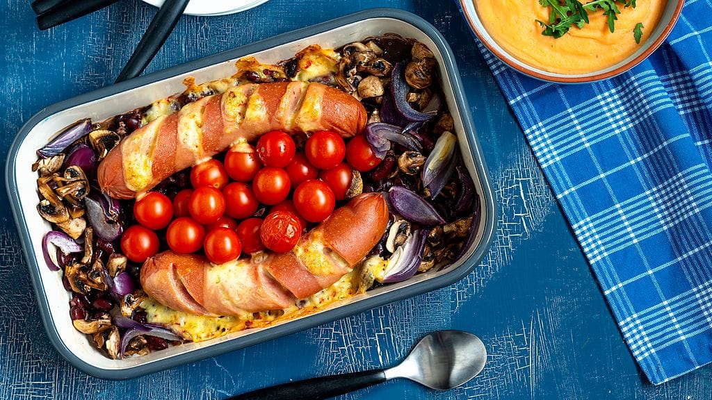 - Poista lenkkimakkarasta kuori ja laita se makkarat uunivuokaan. Leikkaa makkaraan viiltoja.
