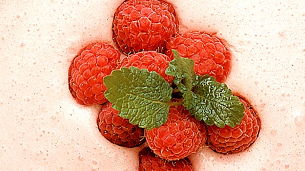 3. Annostele vaahto jääkylmille lautasille tai annoslaseihin ja pane pariksi tunniksi jääkaappiin. Koristele kokonaisilla vadelmilla ja sitruunamelissalla.