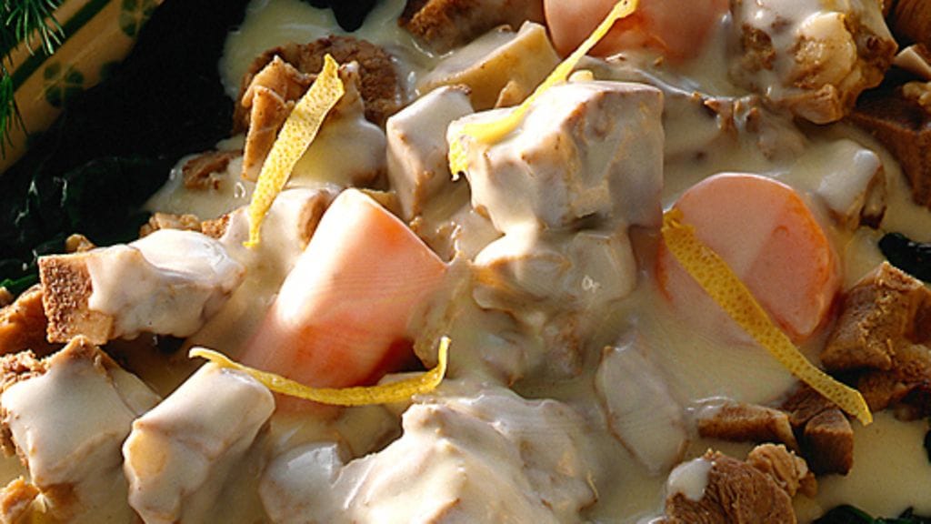 1. Leikkaa liha 2x2 cm:n kokoisiksi kuutioiksi. Kuori ja paloittele salottisipuli ja porkkanat. Kuumenna kattilassa vesi kiehuvaksi, nosta liha kattilaan ja anna kiehua uudestaan. Kaada liha lävikköön ja huuhtele kylmällä vedellä. Pese kattila, laita liha uudestaan siihen ja täytä kylmällä vedellä. Kuumenna kiehuvaksi, kuori vaahto huolella, lisää liemeen pippurit, laakerinlehti, suola ja porkkanat. Keitä noin 1 tunti, tai kunnes liha on mureaa. Nosta liha ja porkkanat liemestä ja pidä lämpimänä. Keitä lientä kokoon, kunnes jäljellä on 6-7 dl ja siivilöi se. Ota erilleen 3 dl kastiketta varten.