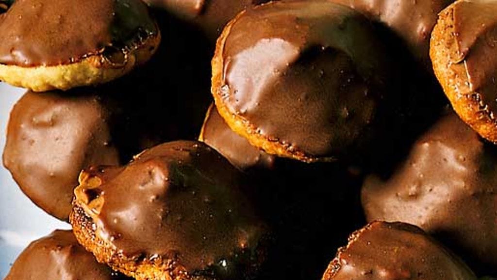 3. Levitä täyte pikkuleipäpohjille huippumaisesti. Laita ne jääkaappiin jähmettymään. Sulata suklaa ja kookosrasva kattilassa ja lämmitä sileäksi kuorrutukseksi. Kasta keksien päällisosa kuorrutukseen. Laita ne leivinpaperille viileään.