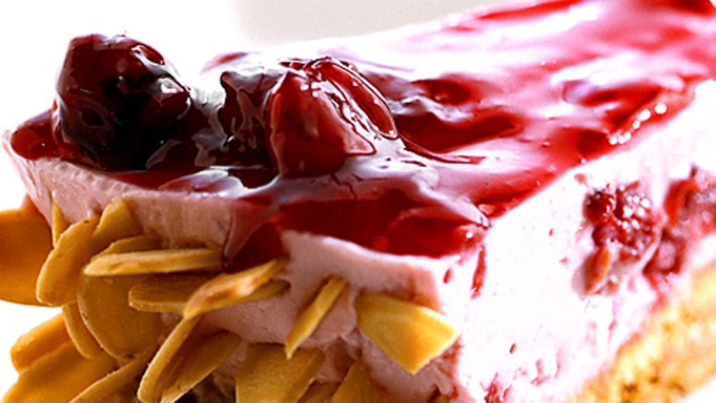 3. Ota torttu jääkaapista n. 20 minuuttia ennen tarjoilua. Paahda mantelilastut voissa ja pistele ne tortun ympärille. Asettele vadelmat tortun päälle ja sekoita hyytelö pehmeäksi, penslaa kakku hyytelöllä.