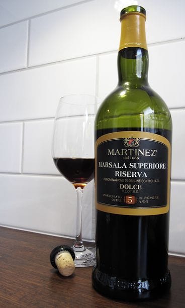 Ruokalajin sydän on väkevä Marsala-viini. Se on kokenut kovia 1800-luvun kukoistuksensa jälkeen. Viime ajat ovat murjoneet Marsalan suosion pohjalukemiin meillä ja maailmalla. Alkossa laatuja löytyy tasan yksi. Se on sääli, koska Marsala on loistava juoma niin lasissa kuin lautasella. Alkon ainokainen, Martinez Marsala Superiore Riserva Dolce, on makeaa laatua, dolcea ja toimii siten jälkkärin kyljessä tai pelkästään herkutellen. Kuiva versio, secco, on mahtava aperitiivi. Omasta pullosta kuluu yleensä 2/3 ruoanlaittoon ja leivontaan - toisinaan kokonaan. Katkerana katselinkin italialaisessa marketissa vastaavaa viiniä myytävän vitosella (Alkossa 15 €). Nappasin mukaan.