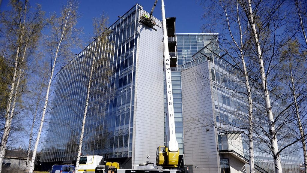 Nokian logo poistettiin yhtiön entisen pääkonttorin seinistä Espoon Keilaniemessä viime yönä.