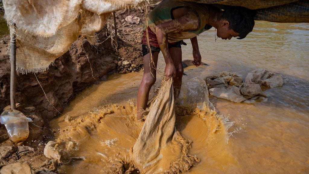Kippurassa kulkevat lapset kantavat porottavan auringon alla painavia säkkejä täynnä maa-ainesta, josta he yrittävät veden avulla huuhtoen löytää kultaa. Martin selittää, että "kaikki kultainen jää kiinni elohopeaan", joka on sekä ihmiselle että ympäristölle myrkyllistä ja jota kaivoksella käytetään kullan erottamiseksi malmista.