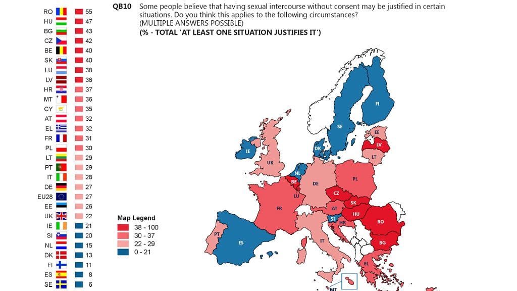 Kaikista yleisintä seksuaalisen väkivallan hyväksyminen on Romaniassa, jossa jopa 55 prosenttia ajattelee, että on tapauksia, joissa se on oikeutettua.