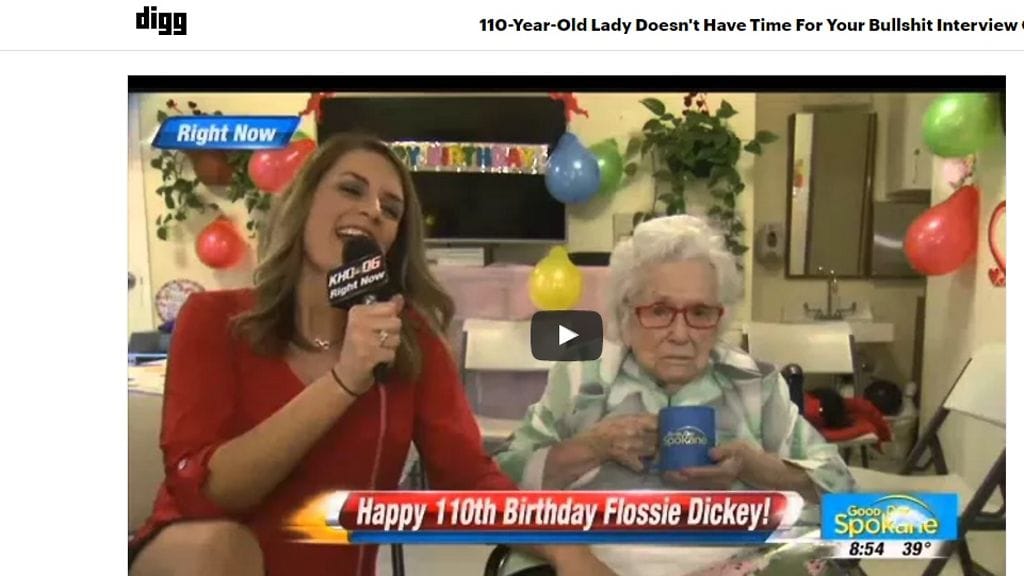Spokanessa Yhdysvalloissa juhlittiin Flossie Dickeyn 110-vuotissyntymäpäiviä. Paikallisuutisten reportteri saapui haastattelemaan päivänsankaria, mutta rouva ei ollut juttutuulella.