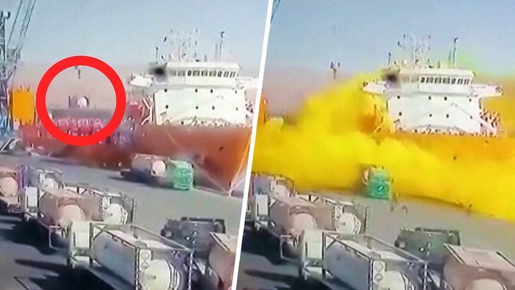 Akaban sataman valvontakameratallenteella näkyy, kuinka rahtialukseen ollaan lastaamassa isoa säiliötä, kun se putoaa kesken lastauksen ja räjähtää ilmaan.