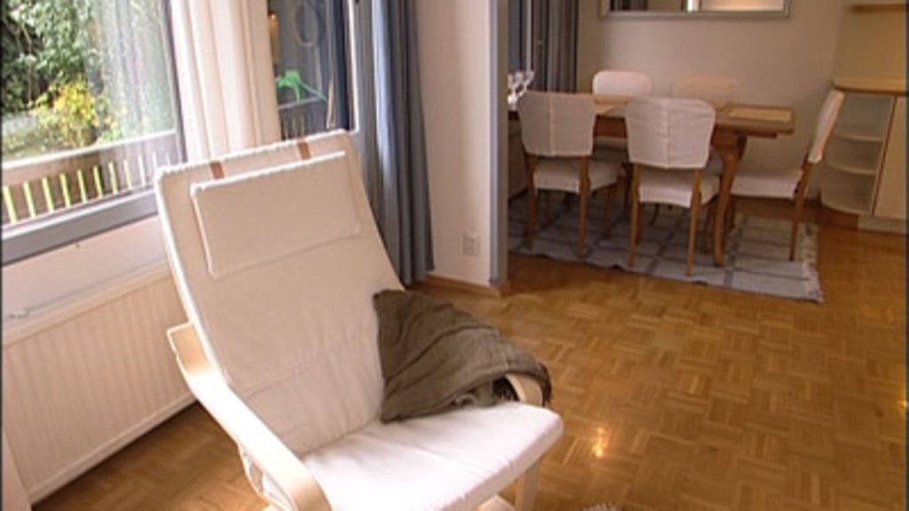 Siniharmaa seinäväri, johon myös verhot on sävytetty, sai jäädä. Tapettiseinät maalattiin raikkaan valkoisella Tikkurilan silkinhimmeällä sisämaalilla, sävy F497. Tilaa täydennettiin Ikean skandinaavisilla nojatuoleilla, pöydillä ja valaisimilla.