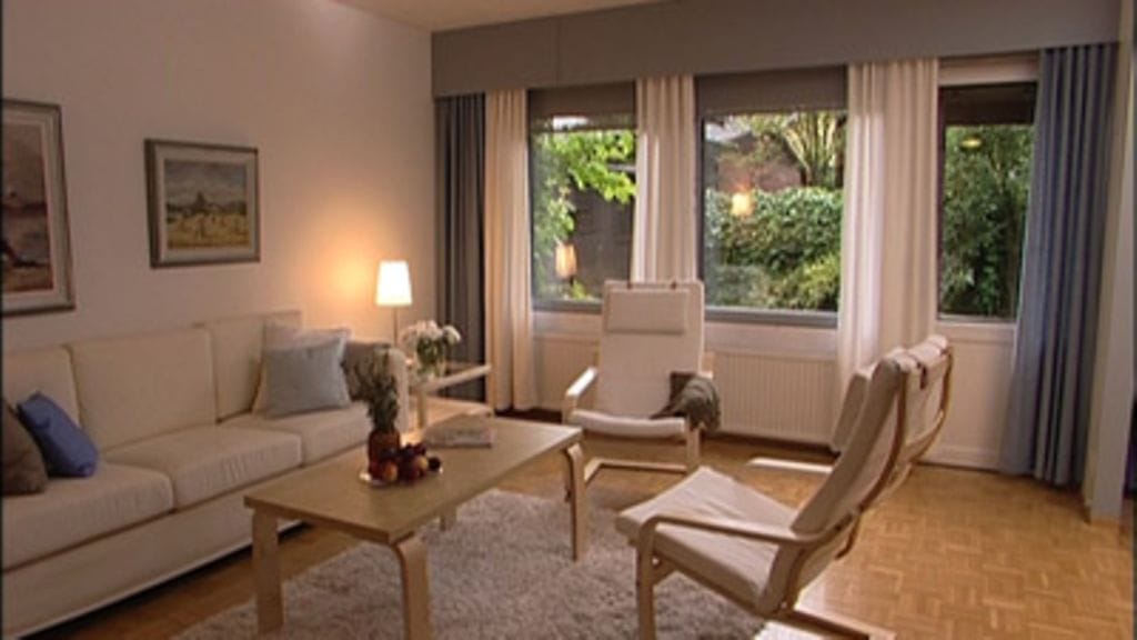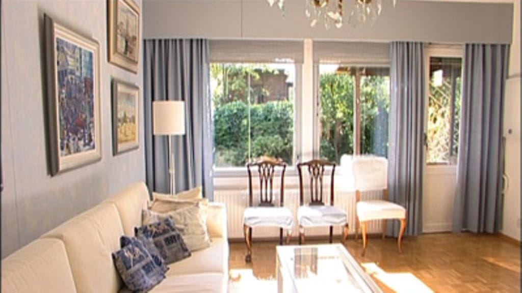 Olohuoneen tyyli oli jäänyt valitettavasti parinkymmenen vuoden taakse. Kohde kaipasi siis päivitystä – ja raikastusta. Voimakkaan siniset tapetit saivat lähteä, samoin kuin kattokruunut ja raskaat, kultakehyksiset taulut. Parketti oli ikäisekseen loistavassa kunnossa.