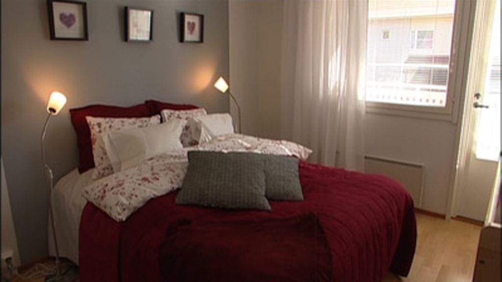 Vanhempien makuuhuone kaipasi eloa ja houkutusta, joten tapetit poistettiin ja seinät saivat saman sävyn kuin olohuone. Ikeasta tuotiin uudet verhot ja vuodevaatteet lämpimillä punaisilla sävyillä.