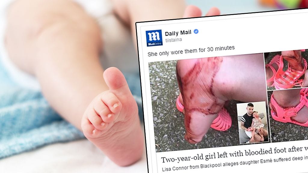 Perheenäiti Lisa Connor jakoi kuvat tyttärensä ilmeisen kipeistä jaloista sosiaalisessa mediassa. Äiti kertoo Daily Mailille ottaneensa jo yhteyttä kenkien valmistajaan Nextiin ja pyytänyt poistamaan kengät myynnistä.