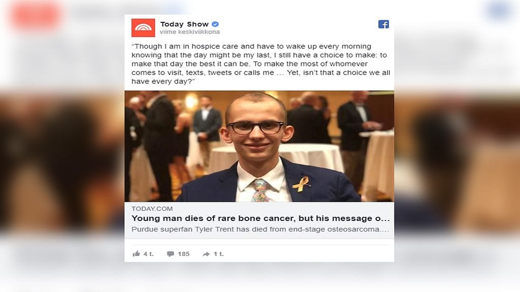 Yhdysvaltalainen Tyler Trent sairasti luusyövän kolmesti. Viimeisellä kerralla syöpä levisi selkärankaan ja munuaisiin. Sen sijaan, että olisi nauttinut elämästään opiskelijana Purduen yliopistossa, hän vietti viimeiset päivänsä saattohoidossa kotonaan.