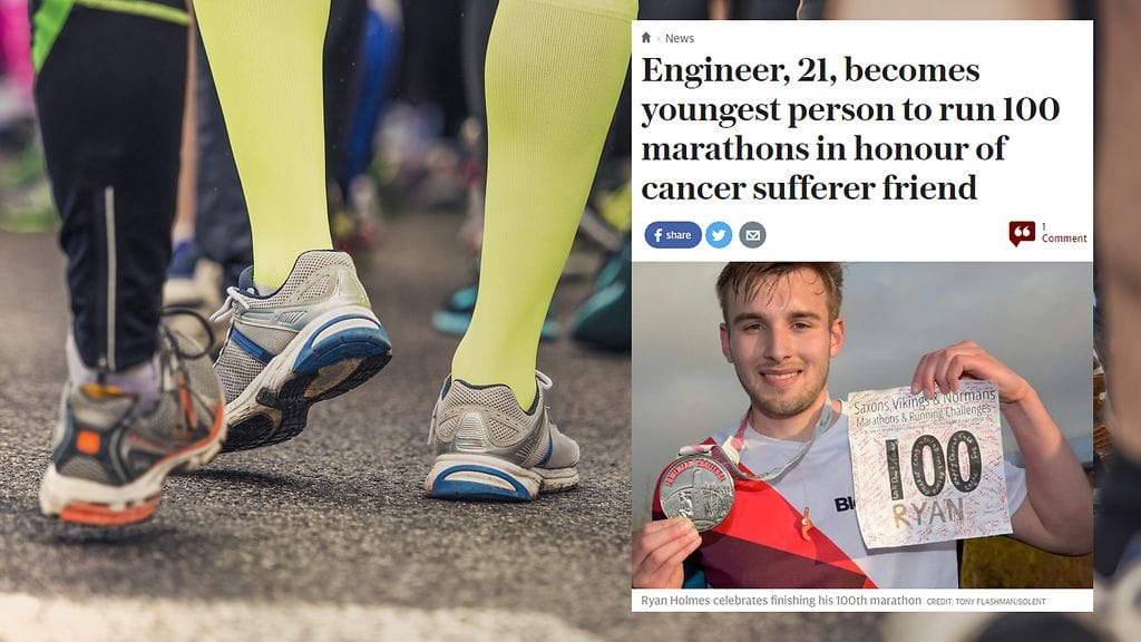 Ryan Holmes on juossut jo sata maratonia. Erikoisen saavutuksesta tekee se, että Holmes on vasta 21-vuotias. Ystävänsä syöpäkamppailun inspiroima Holmes rikkoi saavutuksellaan myös aiemman maraton-ennätyksen, kertoo The Telegraph.