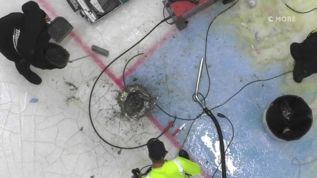 Reikä syntyi, kun hallin työntekijä porasi reikää toisen maalin tolpan alle. Poraaminen rikkoi jäädytysputken, joka puski jäälle valtavasti nestettä. Ja lopputuloksena oli valtava reikä.