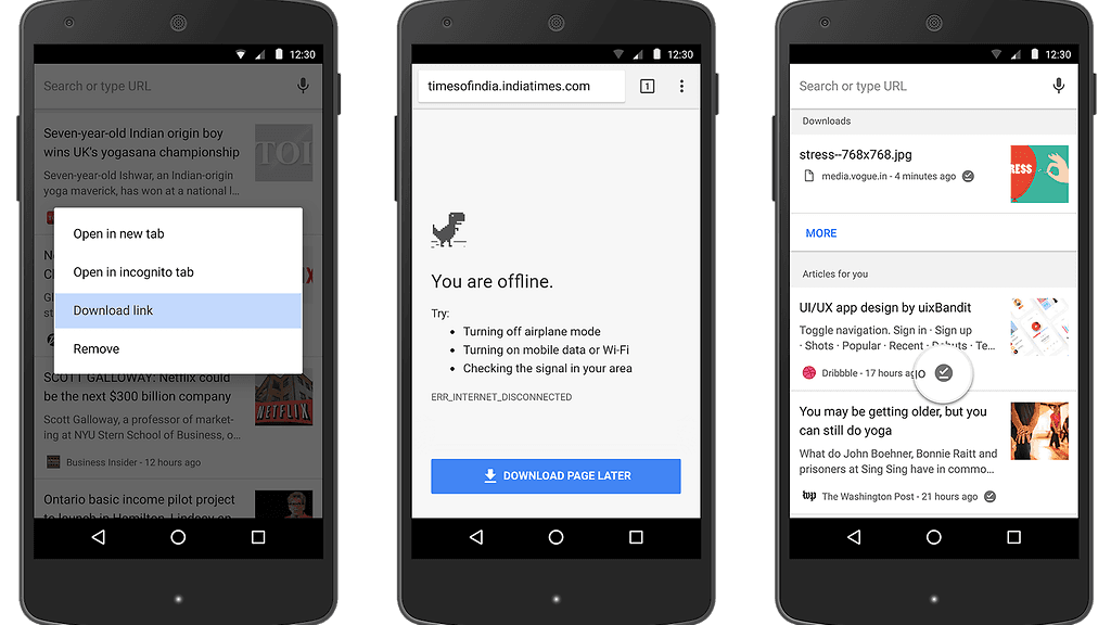 Google tekee nyt suositun mahdollisuuden käytöstä aiempaa helpompaa. Jatkossa mitä tahansa linkkiä voi painaa pitkään ja valita avautuvasta valikosta selkeämmin haluavansa ladata linkin sisällön. Toisena uudistuksena offline-tilassa oltaessa ja yritettäessä ladata verkkosivua, näkyy alareunassa uusi painike sivun lataamiseksi muistiin myöhemmin verkkoyhteyden palautuessa.
