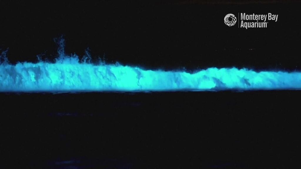 Kalifornian Monterey Bayn rannalla nähtiin elokuussa aavemaisen kaunis näky, kun aallot hehkuivat kirkkaan sinistä valoa.