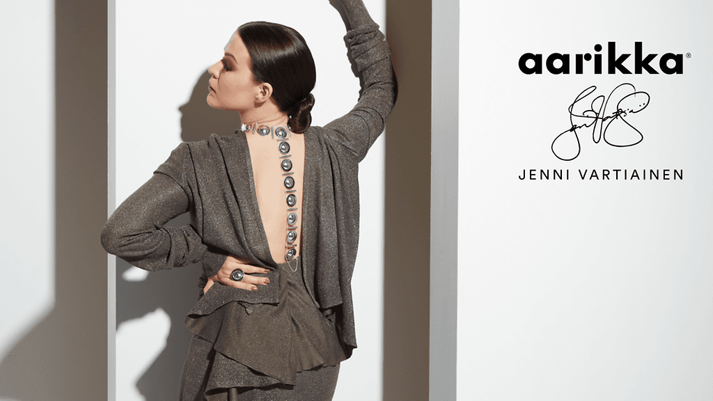– Kaija Aarikan vanhoista arkistoista löytyi kuva metallisesta kravatista. Innostuin siitä ja halusin tuoda sen nykyaikaan, Kokonainen-sarjana. Se toimii pysäyttävänä katseen vangitsijana kenelle tahansa. Koko neliosaisella Aarikka-sarjalla olen halunnut kunnioittaa Aarikan uskomatonta historiaa. Olen halunnut, että kaikki sarjan korut toimivat yksin tai niitä voi yhdistellä omalla, itselleen sopivalla tavalla, Jenni Vartiainen kertoo.