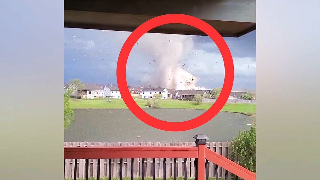 Katso ylhäällä olevalta videolta, kuinka hurjan kokoinen tornado tuhosi Aaronin naapureiden taloja.