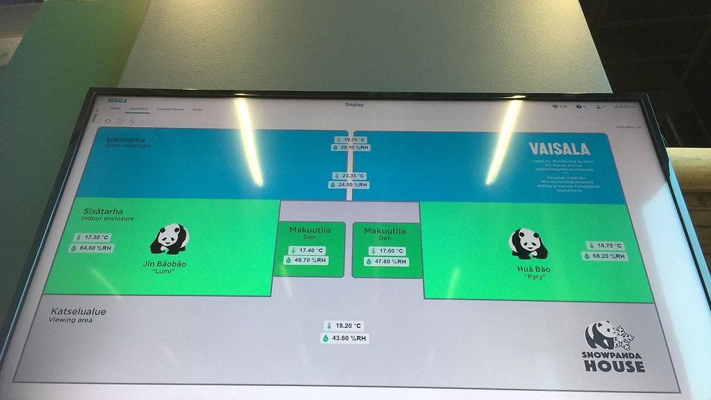 Ähtärin pandatalon seinällä on iso monitori, jossa on valtavasti tietoa. On lämpötiloja, on tietoja ilmankosteudesta pandatalon eri tiloissa. Yksi näytöistä sijaitsee yleisön nähtävillä näköalatasanteella.