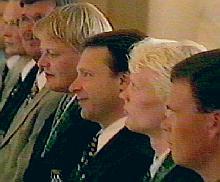 Urheilijat marssivat Goottilaiseen saliin joukkueen ylijohtajan Ilkka Kanervan johdolla. Mukana olivat myös mm. olympiakomitean valmennuspäällikkö Heikki Kantola ja Suomen olympiakomitean puheenjohtaja Tapani Ilkka. Peilisaliin katetun kahvipöydän ääreen istahti niin ikään lajivalmentajia. Kaikkiaan oli vieraita kolmisenkymmentä.