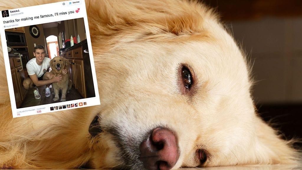 Aidon kokoinen pahvikuva rakkaasta kultaisestanoutajasta lämmittää taatusti Ostrowskin mieltä kaukana kotoa. Kuva yllätyksestä keräsi tuhansia tykkäyksiä Twitterissä.