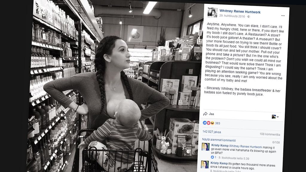 Whitney Renee Huntwork kyllästyi imetystä kritisoiviin kommentteihin ja päätti julkaista omansa – runomuodossa. Huntwork julkaisi Facebookissa kuvan, jossa imettää lastaan kaupan käytävällä. Oheen hän riimitteli runon, jossa kertoo, että aikoo imettää jatkossakin missä haluaa.