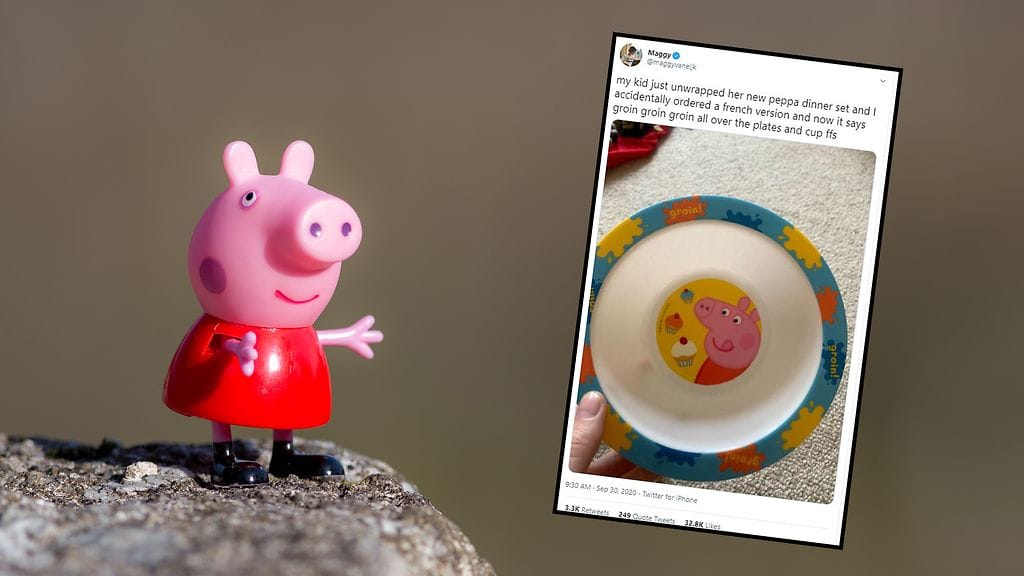 – Lapseni avasi juuri Pipsa Possu -astiaston paketista ja tilasin vahingossa ranskankielisen version. Nyt lautanen ja kuppi on täynnä haaroväliin viittaavaa tekstiä, Maggy kirjoittaa Twitterissä liittämänsä kuvan kera.