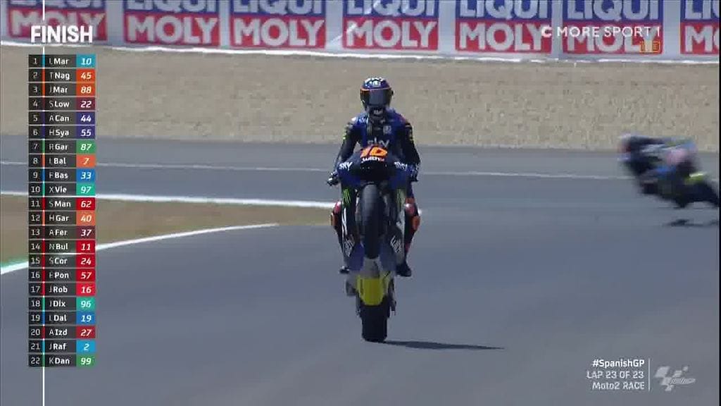 Kisan voittanut 22-vuotias Marini on äitinsä puolelta Valentino Rossin velipuoli. Kisan jälkeen Rossi saapuikin varikkosuoralle onnittelemaan Marinia.