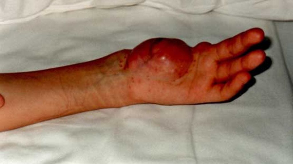 − Se alkoi olla perunan kokoinen. Kättä särki koko ajan. Siellä oli niin paljon painetta, että näytti kuin käsi olisi räjähtämäisillään. Iho ei ollut antaa enää periksi, Tuomo kuvaa.