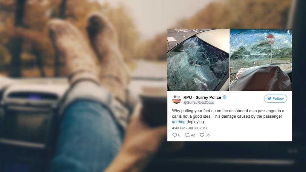 Surreyn poliisi muistuttaa, että jalkojen pitäminen auton kojelaudalla voi olla pahimmillaan jopa hengenvaarallista.