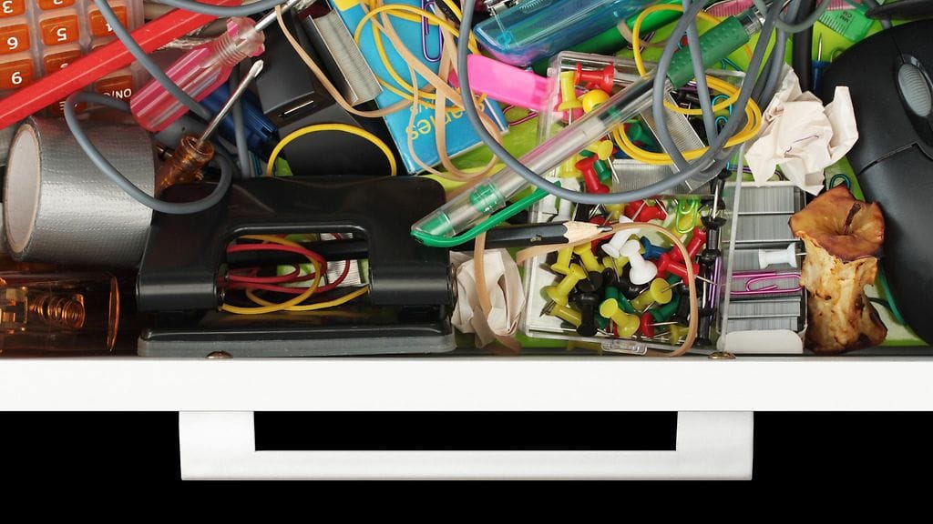Tee näin: Ota laatikko kokonaan irti ja kaada kaikki tavarat vaikkapa matolle. Tee pieni inventaario ja hankkiudu ihan ensimmäiseksi eroon kaikesta roskasta. Heitä pois esimerkiksi vanhat kuitit, kuivunut liimapuikko ja rikkinäiset mustekynät. Katso sitten jäljelle jääneitä tavaroita ja mieti, missä niiden paikka on oikeasti. Vie ruuvimeisseli työkalupakkiin ja tärkeät paperit niille kuuluville paikoille.
