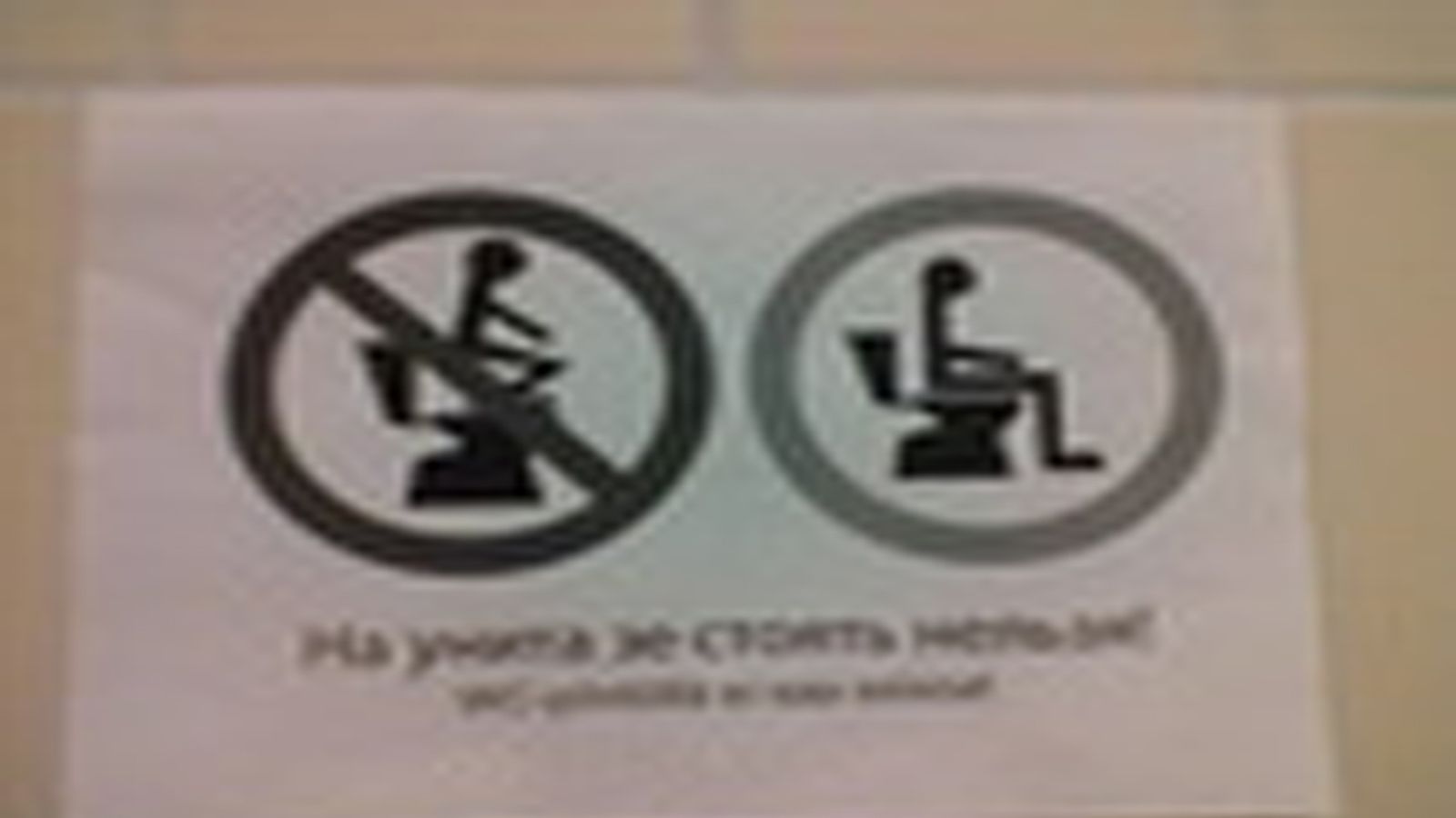 Kylteissä olevissa kuvissa ja venäjänkielisessä tekstissä opastetaan, että WC-pöntöllä tulisi istua eikä seistä.