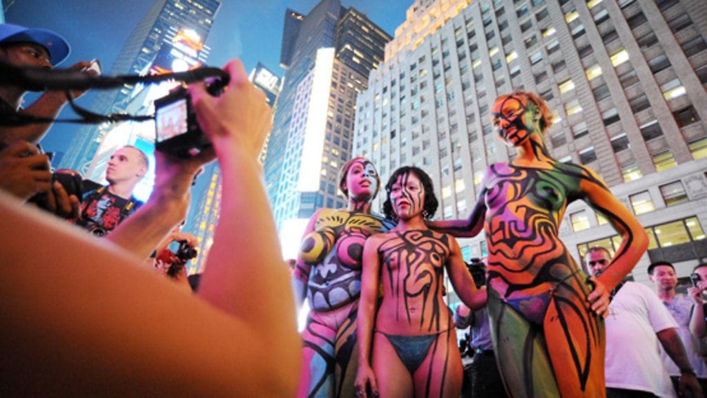 Alastomat bodypaintingmallit käänsivät kaduntallaajien päät keskellä vilkkainta Times Squarea. Mallien ympärille kerääntyi sankka joukko uteliaita silmäpareja.