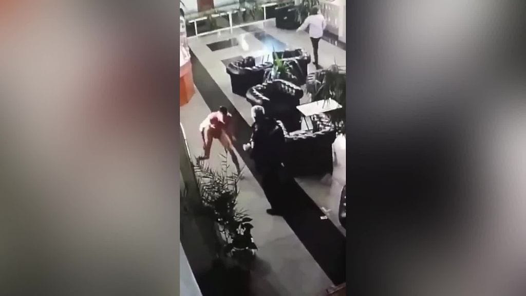 Tallenteella näkyy ensin, miten yksi henkilö juoksee odotushuoneen läpi alaston mies perässään. Mies pysähtyy kuitenkin kesken takaa-ajon havaittuaan penkillä istuneen vartijan.