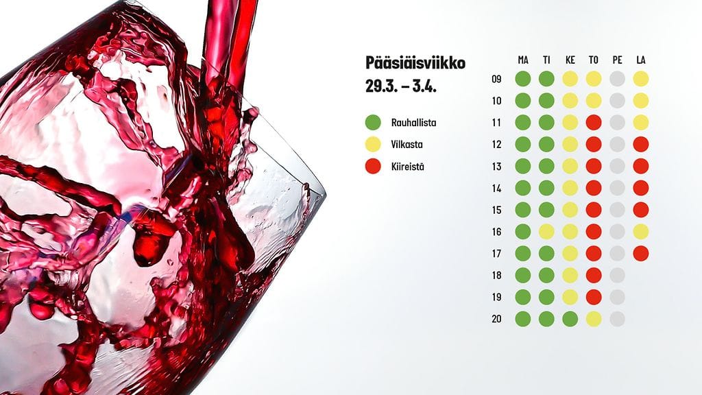 Liikennevalosta näet myös Alkon aukioloajat pääsiäisen läpi. Alkon verkkosivujen tiedotteen mukaan kaupan kiireisin päivä on kiirastorstai 1.4. Perjantaina Alko on koko päivän kiinni. Kaikkein hiljaisinta on kello 9 ja 11 välillä.